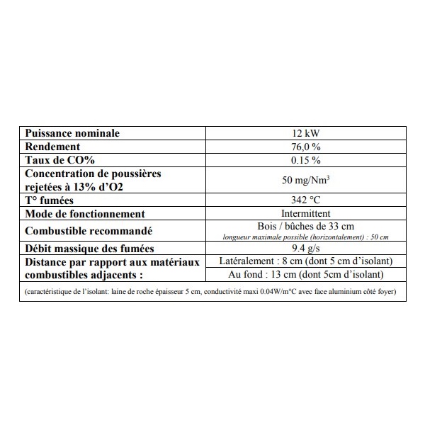 (caractéristique de l’isolant: laine de roche épaisseur 5 cm, conductivité maxi 0.04W/m°C avec face aluminium côté foyer)